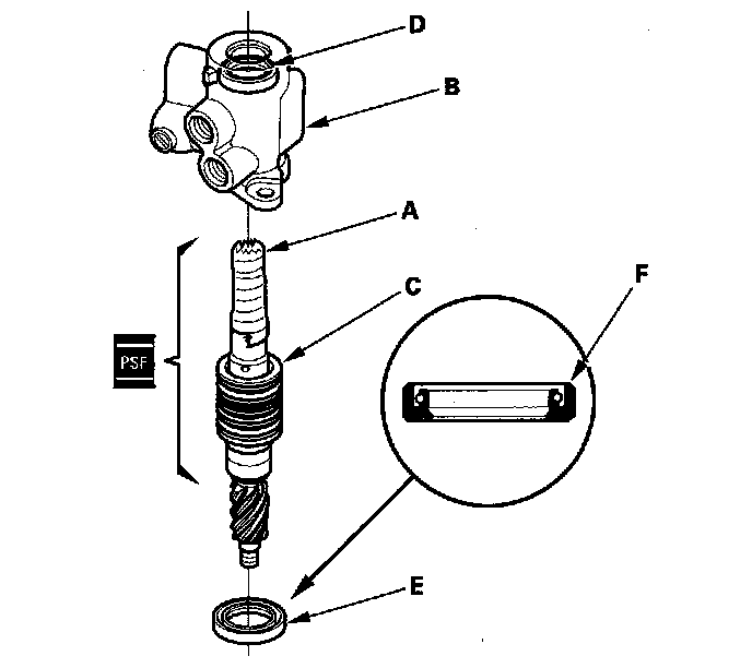 39. Insert the pinion shaft into the valve housing (B). Be careful not to damage the valve seal rings (C) and valve oil seal sealing lip (D).