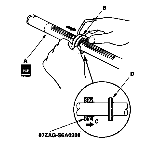 50. Install the cylinder end seal (B) onto the steering rack with its grooved side (C) toward the piston (D).