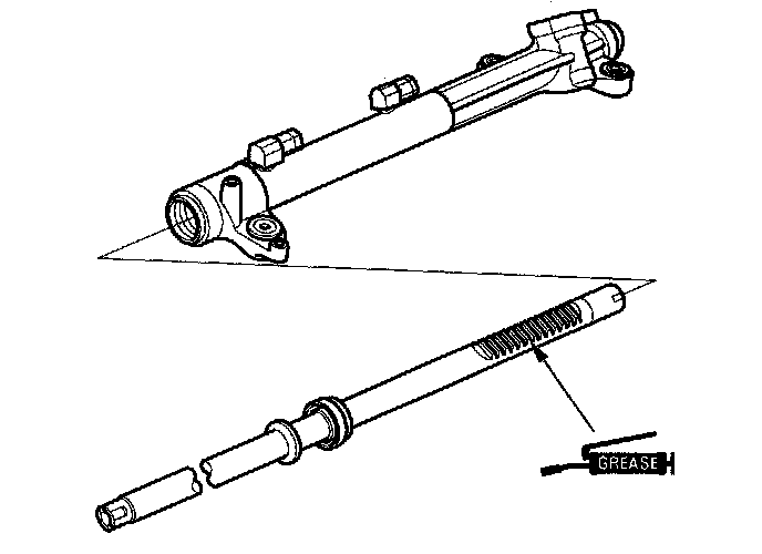 53. Apply multipurpose grease to the steering rack teeth, then insert the steering rack into the gearbox housing. Be careful not to damage the inner surface of the cylinder wall with the rack edges.