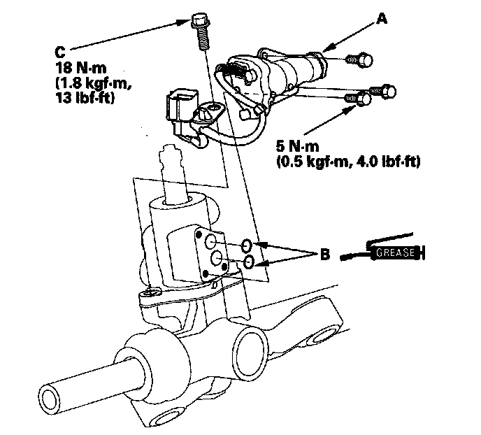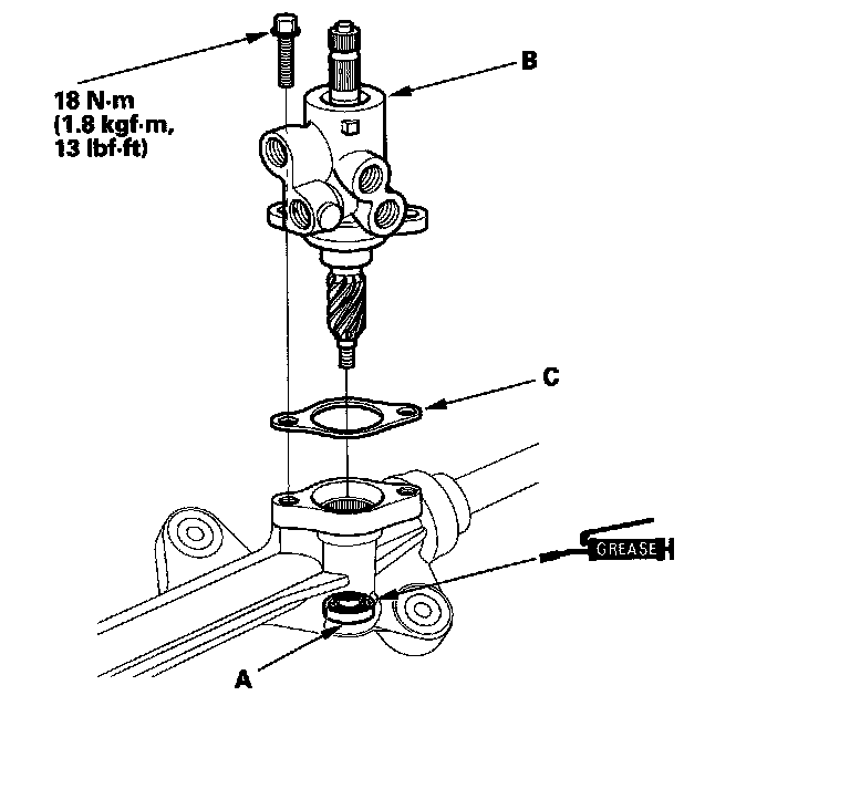 64. Apply multipurpose grease to the bearing (A) in the gearbox housing, and install the valve body unit (B) and new gasket (C) by engaging the gears. Note the valve body unit installation position (direction of line connections). Then loosely install the two flange bolts.