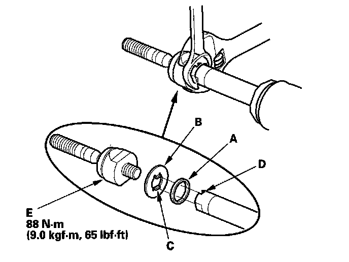 75. Install the new rubber stop (A) and lock washer (B). Align the lock washer tabs (C) with the slots (D). Install the rack end (E) while holding the lock washer in place. Repeat this step for the other side of the rack.