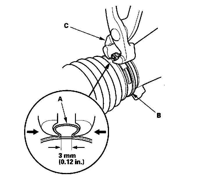 81. Clean off any grease or contamination from the boot installation grooves (A) and around the gearbox housing. Install the boots (B) on the rack ends with the tie-rod clips (C), and fit the boot end in the installation grooves in the housing properly.
