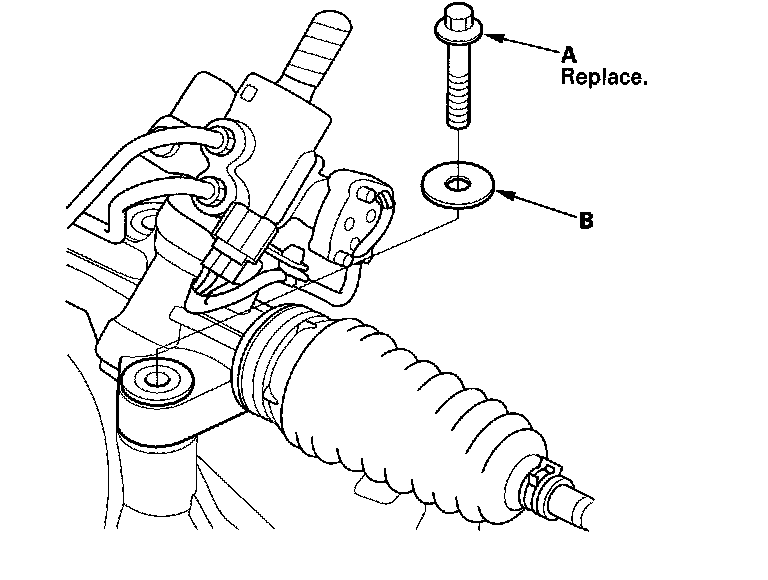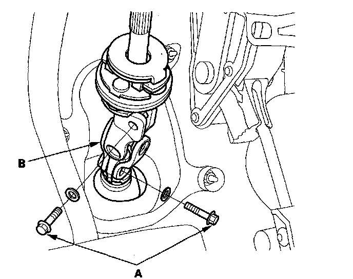 8. Remove the steering joint bolts (A), then disconnect the steering joint (B) from the pinion shaft and the steering column shaft.