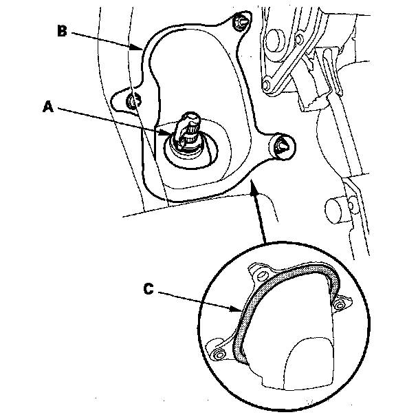 10. Remove steering joint cover B. Be careful not to damage the mating surface on joint cover B and the pinion shaft grommet. Replace the cover seal (C) if necessary.