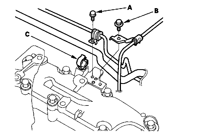 18. Remove the feed line holder mounting bolt (A) and A/T wire line holder mounting bolt (B) on the gearbox stiffener.