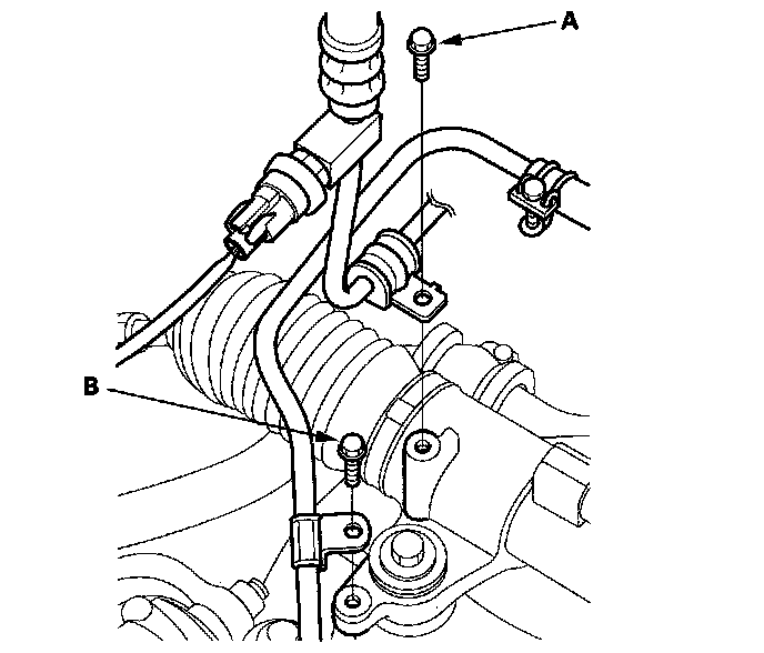 20. Remove the feed line holder mounting bolt (A) and return line holder mounting bolt (B) on the gearbox.