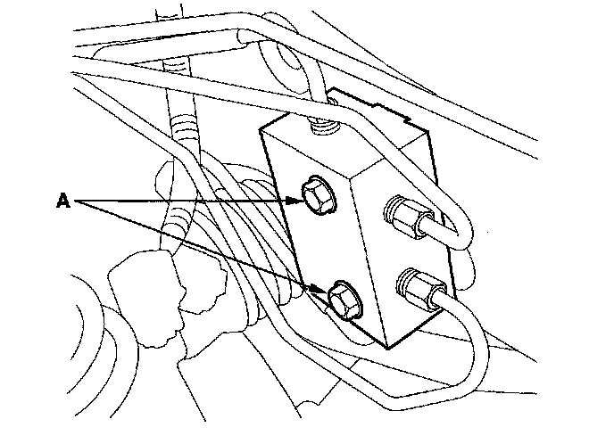 30. Remove the 4-way brake line joint bolts (A). Do not disconnect the lines.