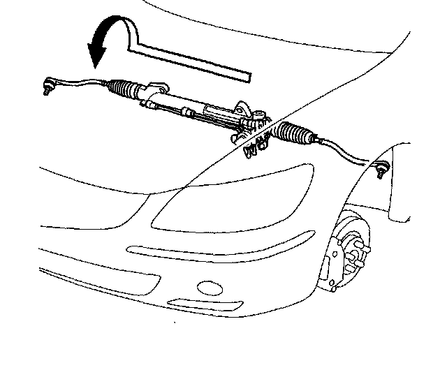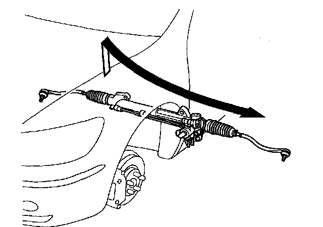 32. Carefully move the steering gearbox as an assembly toward the left side of the vehicle until the pinion shaft clears the wheelwell opening. Be careful not to damage the brake lines with the pinion shaft.