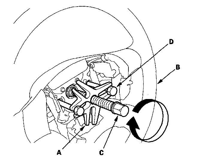 6. Install a commercially available steering wheel puller (A) on the steering wheel (B). Free the steering wheel from the steering column shaft by turning the pressure bolt (C) of the puller.