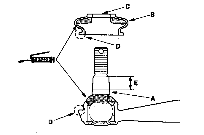 ^ Keep grease off the boot mounting area (D) and the tapered section (E) of the ball pin.