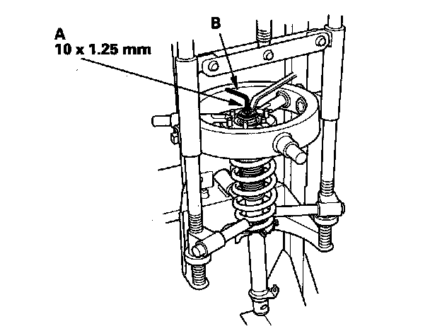 1. Compress the damper spring, then remove the self-locking nut (A) while holding the damper shaft with a hex wrench (B). Do not compress the spring more than necessary to remove the nut.