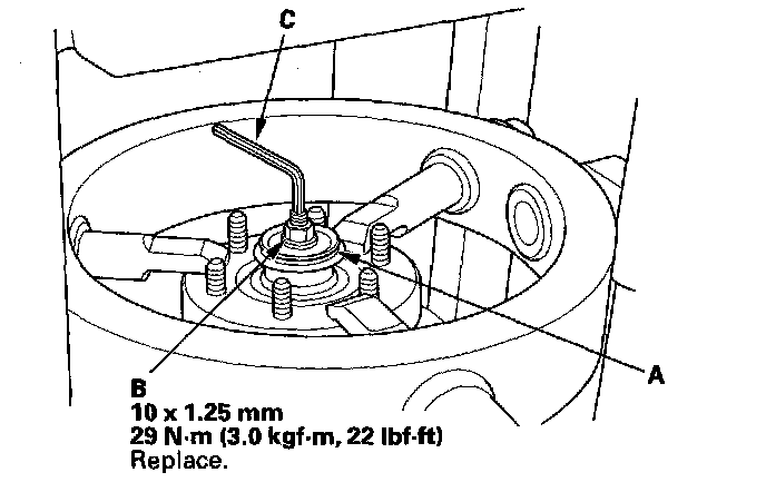 6. Install the washer (A) and a new 10 mm self-locking nut (B). Hold the damper shaft with a hex wrench (C), and tighten the 10 mm self-locking nut to the specified torque value.