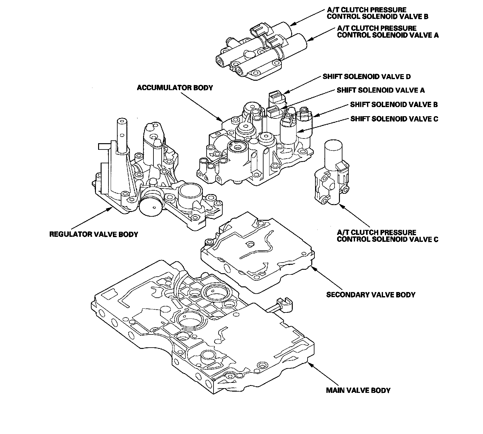 Hydraulic ControlsThe valve body includes the main valve body, the regulator valve body, the secondary valve body, and the accumulator body. The ATF pump is driven by splines on the end of the torque converter which is attached to the engine. Fluid flows through the regulator valve to maintain specified pressure through the main valve body to the manual valve, directing pressure to each of the clutches. The shift solenoid valves A, B, C, and D are mounted on the accumulator body. The A/T clutch pressure control solenoid valves A, B, and C are mounted on the transmission housing.