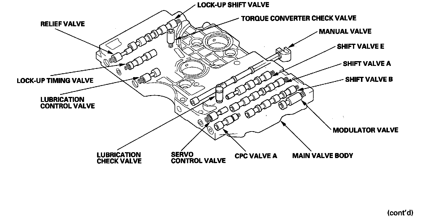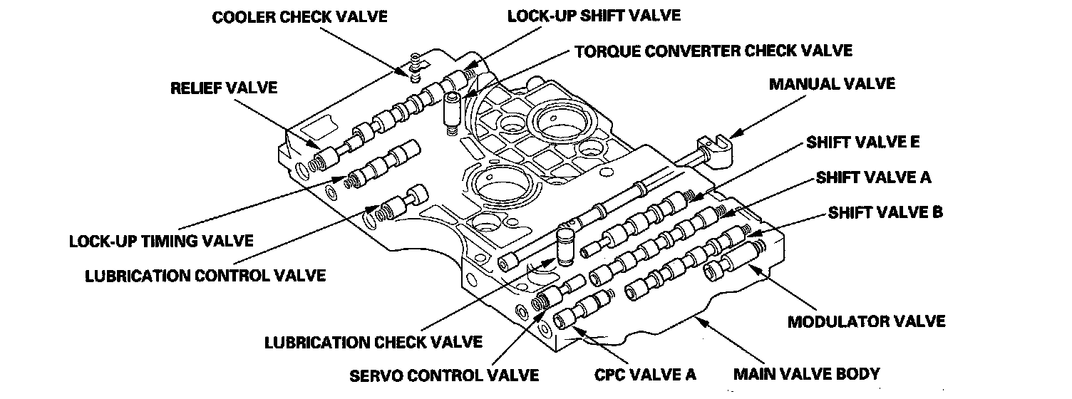 The main valve body contains the manual valve, the modulator valve, the shift valve A, the shift valve B, the shift valve E, the CPC valve A, the servo control valve, the lubrication check valve, the lubrication control valve, the torque converter check valve, the lock-up timing valve, the relief valve, the lock-up shift valve, and the ATF pump gears. The primary function of the main valve body is to switch fluid pressure on and off to control hydraulic pressure going to the hydraulic control system.