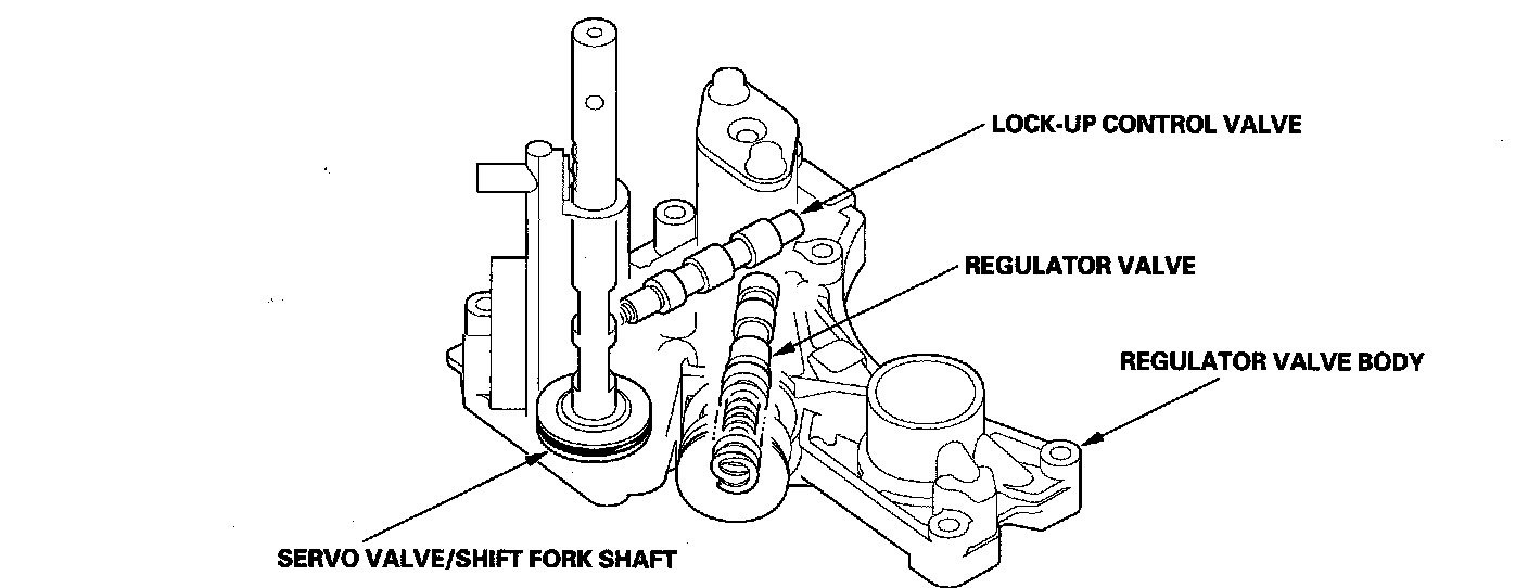 The regulator valve body is located on the main valve body. The regulator valve body contains the regulator valve, the lock-up control valve, the servo valve, and the 3rd accumulator.