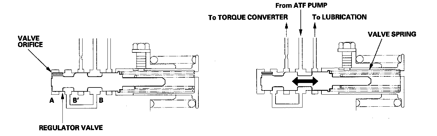 The regulator valve maintains constant hydraulic pressure from the ATF pump to the hydraulic control system, while also furnishing fluid to the lubricating system and torque converter. Fluid from the ATF pump flows through B and B'. Fluid entering from B flows through the valve orifice to the A cavity. This pressure of the A cavity pushes the regulator valve to the spring side, and this movement of the regulator valve uncovers the fluid port to the torque converter and the relief valve. The fluid flows out to the torque converter and the relief valve, and the regulator valve returns under spring force. According to the level of the hydraulic pressure through B, the position of the regulator valve changes, and the amount of fluid from B' through the torque converter changes. This operation is continued, maintaining the line pressure.