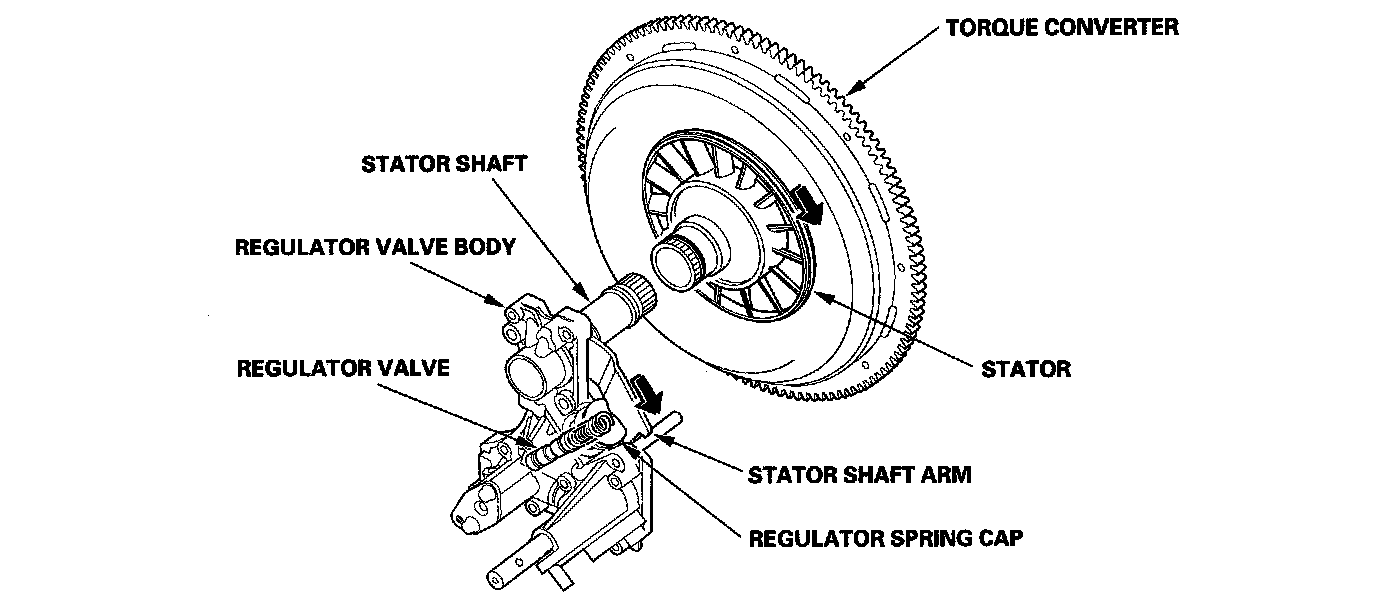 Increases in hydraulic pressure according to torque are regulated by the regulator valve using stator torque reaction. The stator shaft is splined to the stator in the torque converter, and its arm end contacts the regulator spring cap. When the vehicle is accelerating or climbing (torque converter range), stator torque reaction acts on the stator shaft, and the stator arm pushes the regulator spring cap in the direction of the arrow in proportion to the reaction. The stator reaction spring compresses, and the regulator valve moves to increase the line pressure which is regulated by the regulator valve. The line pressure reaches its maximum when the stator torque reaction reaches its maximum.