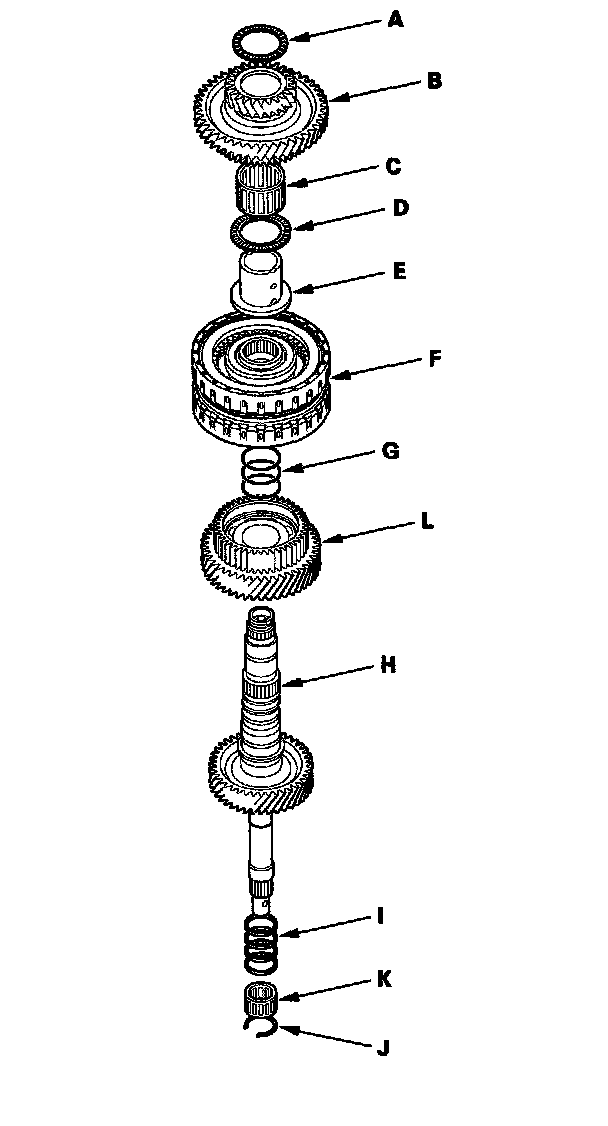 1. Install 2nd gear (A), the thrust needle bearing (B), needle bearing (C), idler gear (D), thrust needle bearing (E), 56 mm washer (F), 1st gear (G), 4th gear (H), 50.2 mm washer (I), 39 mm cotters (J), cotter retainer (K), and snap ring (L) on the countershaft (M).