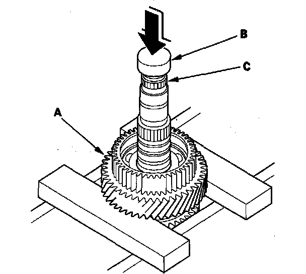 1. Remove the mainshaft 4th gear (A) with a press. Place a shaft protector (B) between the press and mainshaft (C) to prevent damaging the mainshaft.