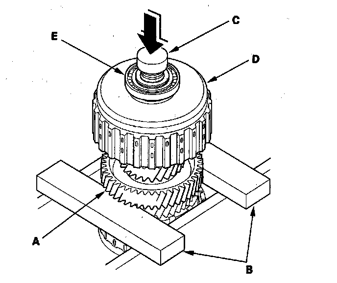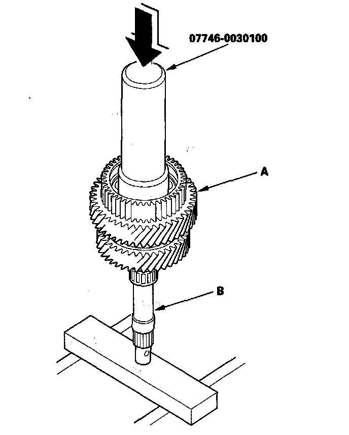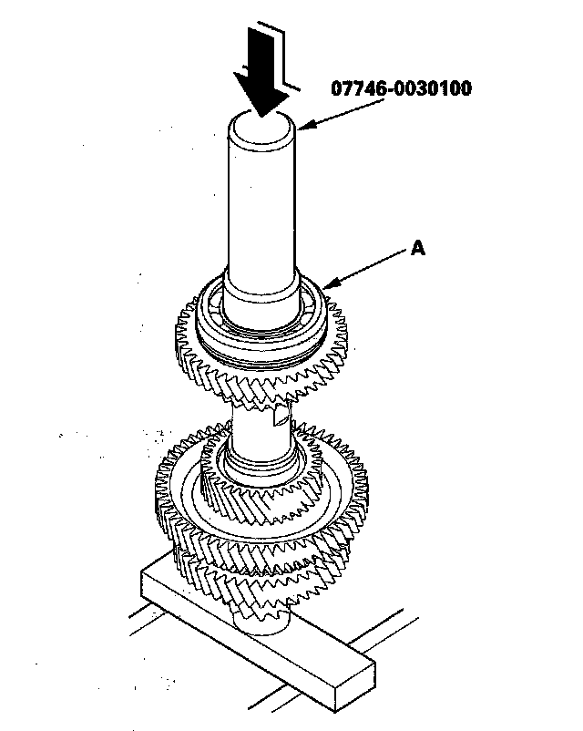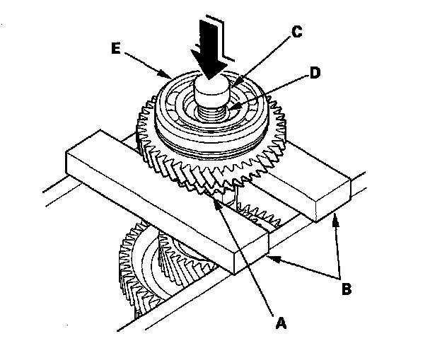 3. Place the countershaft 5th gear (A) on press bases (B), and place a shaft protector (C) between the countershaft (D) and a press to prevent damaging the countershaft.