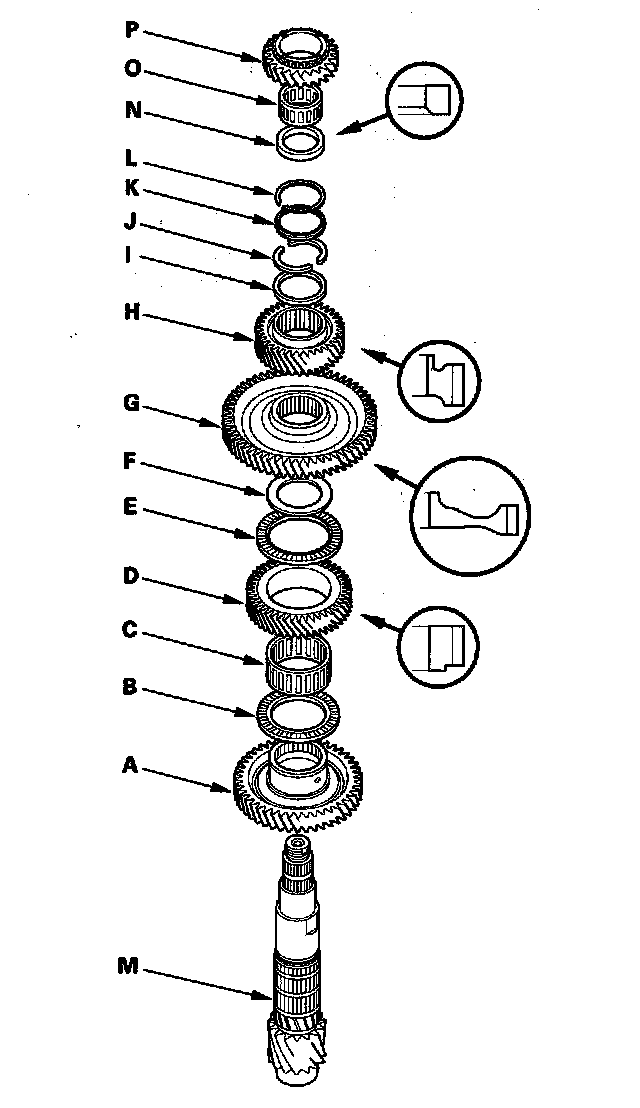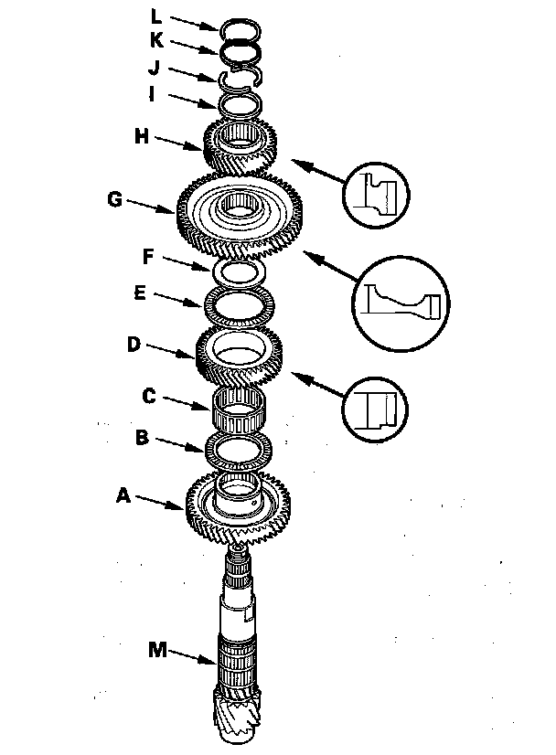 1. Install 2nd gear (A), the thrust needle bearing (B), needle bearing (C), idler gear (D), thrust needle bearing (E), the original thickness 56 mm washer (F), 1st gear (G), 4th gear (H), the original thickness 50.2 mm washer (I), 39 mm cotters (J), cotter retainer (K), and snap ring (L) on the countershaft (M).