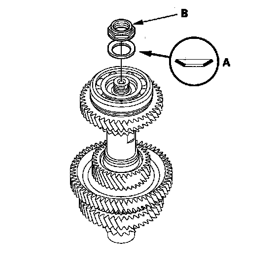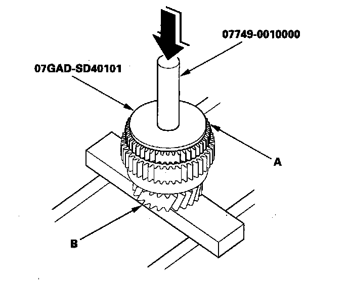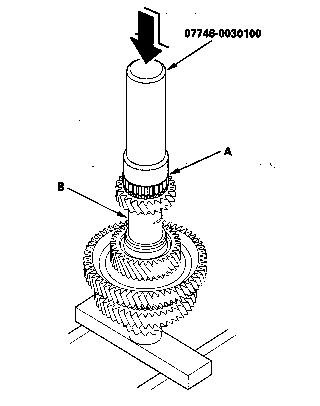 2. Slide the new mainshaft 4th gear (A) over the mainshaft (B), then press it into place using the driver (40 mm I.D.) and a press.