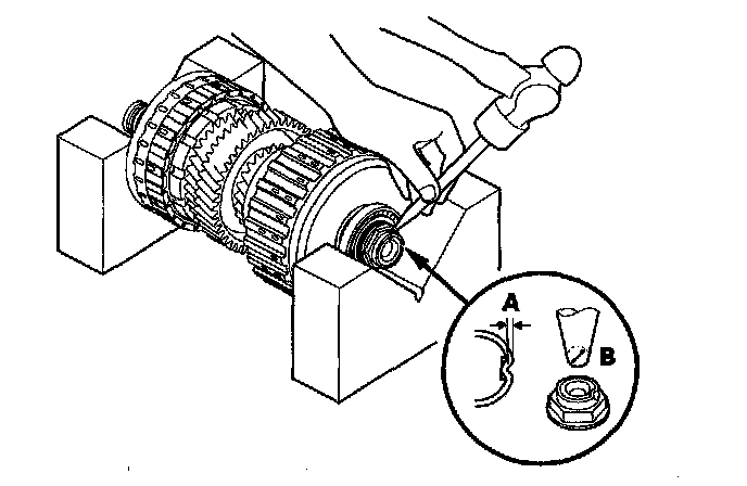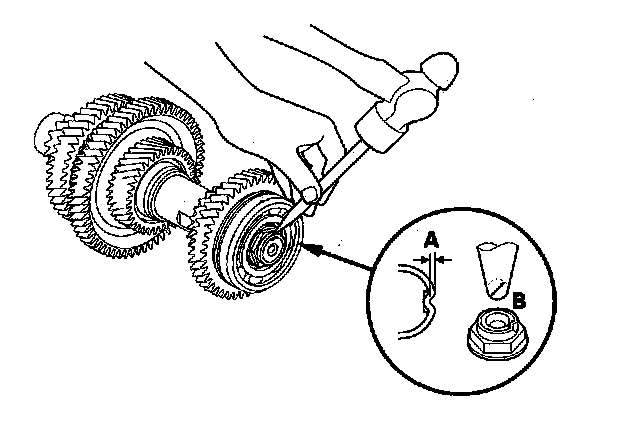 8. Stake the locknut into the shaft to a depth (A) of 0.7 - 1.3 mm (0.03 - 0.05 in.) using a 3.5 mm punch (B).