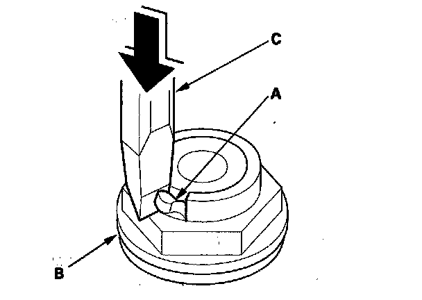 1. Cut the lock tab (A) off the secondary shaft locknut (B) using a chisel (C).