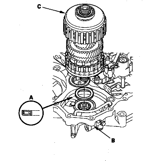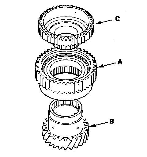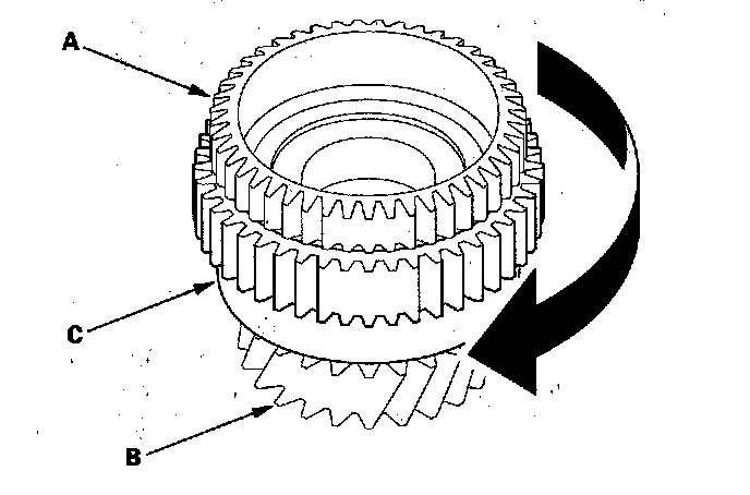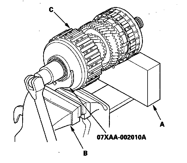 3. Install a new 1st clutch hub (A) over 1st gear (B), and install the 1st-hold clutch hub (C) in 1st gear.