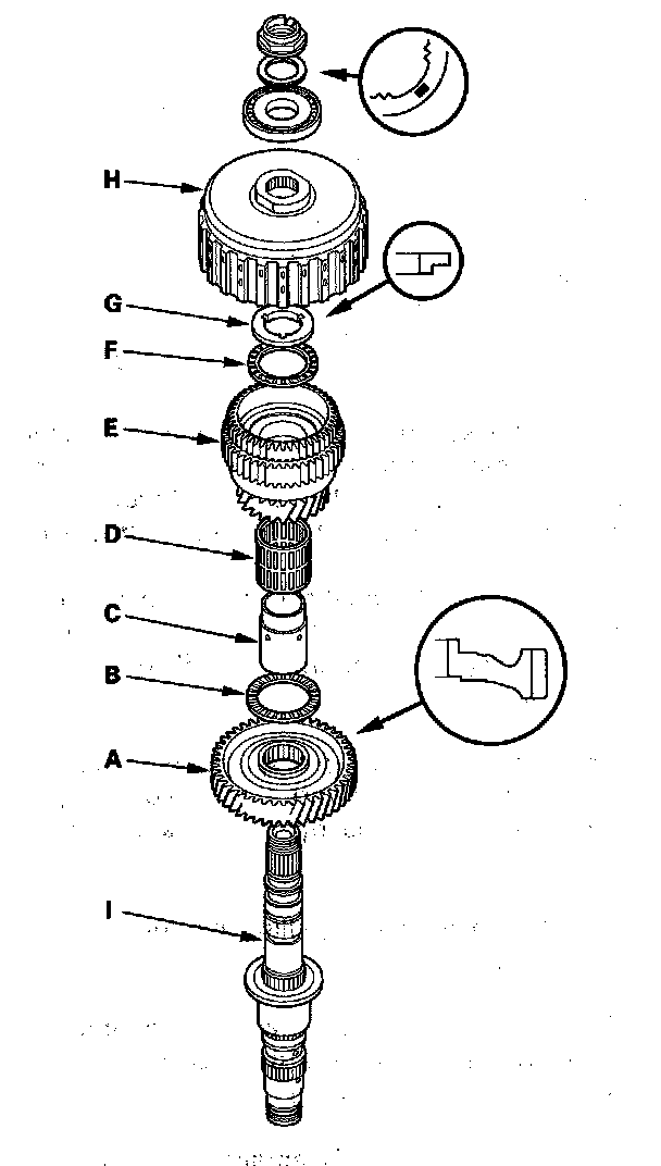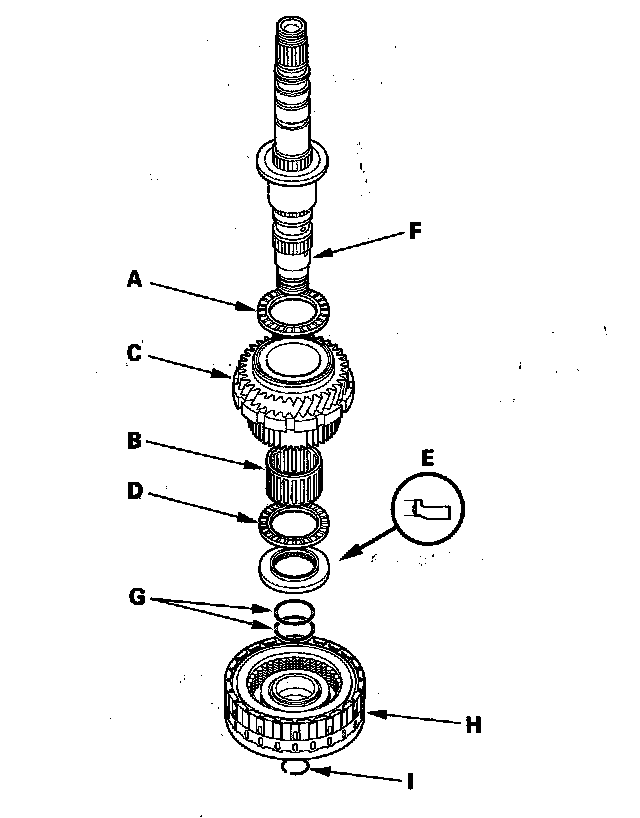 1. Install the idler gear (A), thrust needle bearing (B), 1st gear collar (C), needle bearing (D), 1st gear assembly (E), thrust needle bearing (F), the original thickness 52 mm washer (G), and 1st/1st-hold clutch (H) on the secondary shaft (I). Install the idler gear and 52 mm washer in the direction shown. Do not install the O-rings during inspection.