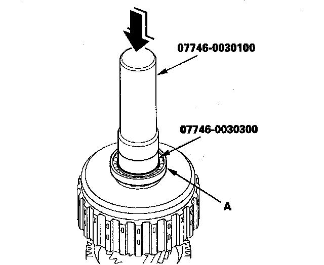 2. Install the ball bearing (A) over the 1st/1st-hold clutch guide using the driver (40 mm I.D.), the attachment (30 mm I.D.), and a press.
