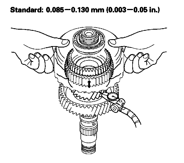 6. Measure the 1st gear axial clearance in at least three places while moving 1st gear. Use the average as the actual clearance.