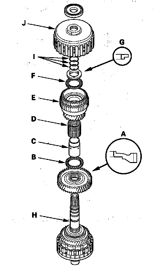 Mainshaft Disassembly, Inspection, and Reassembly1. Remove the thrust needle bearing (A), mainshaft 5th gear (B), needle bearing (C), thrust needle bearing (D), mainshaft 5th gear collar (E), 4th/5th clutch (F), and O-rings (G) from the mainshaft (H).