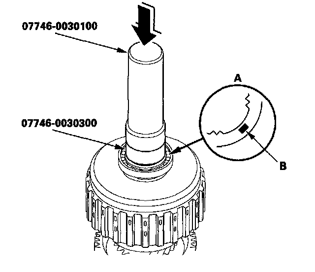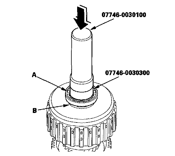 7. Install the ball bearing (A) over the 1st/1st-hold clutch guide (B) using the driver (40 mm I.D.), the attachment (30 mm I.D.), and a press.