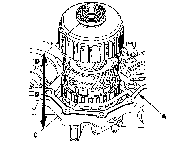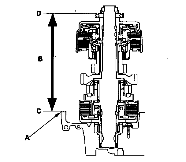 3. Measure the installed height (B) of the secondary shaft between the surface (C) of the gasket and the top of the ball bearing outer race (D), then note the measurement.
