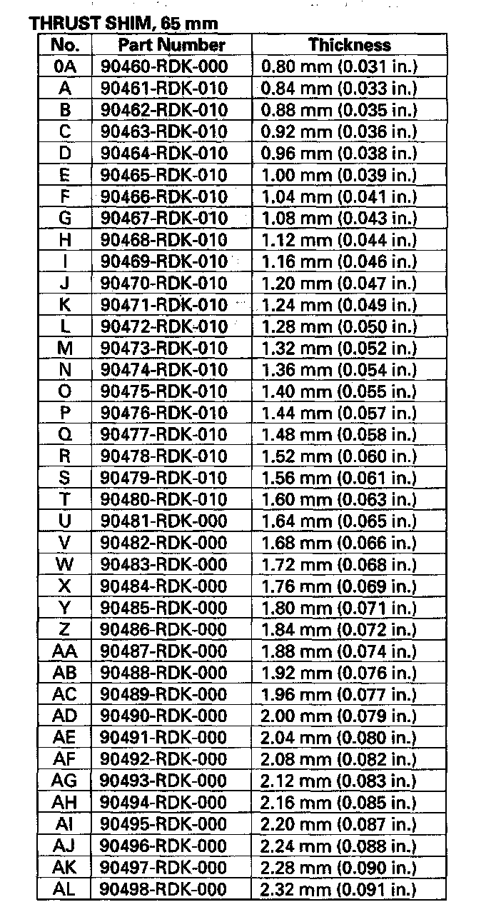 6. Select the 65 mm thrust shim from the following table.