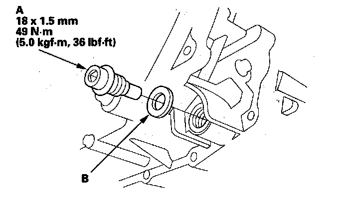 5. Reinstall the drain plug with a new sealing washer (B).