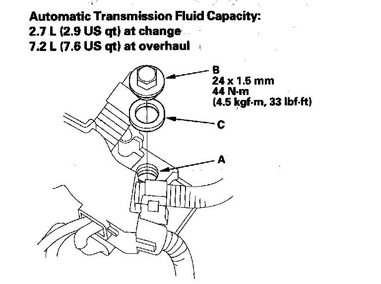 6. Refill-the transmission with the recommended fluid through the filler hole (A). Always use Acura ATF DW-1 (ATF Z1 has been replaced by ATF DW-1, Honda Service News Nov 2010) Automatic Transmission Fluid (ATF). Using a non-Acura ATF can affect shift quality.