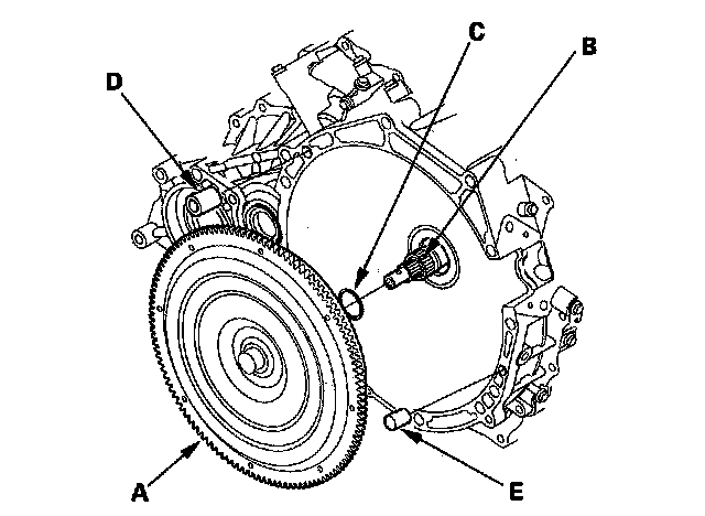 4. Install the 14 mm dowel pin (D) and 10 mm dowel pin (E) in the torque converter housing.