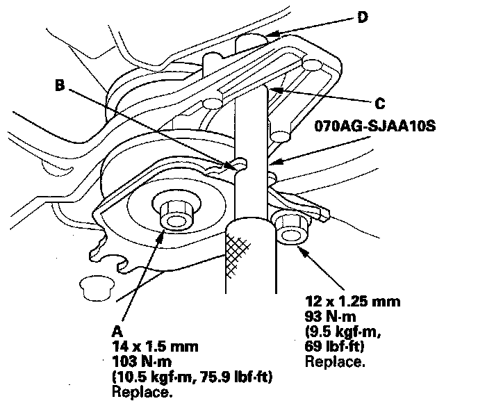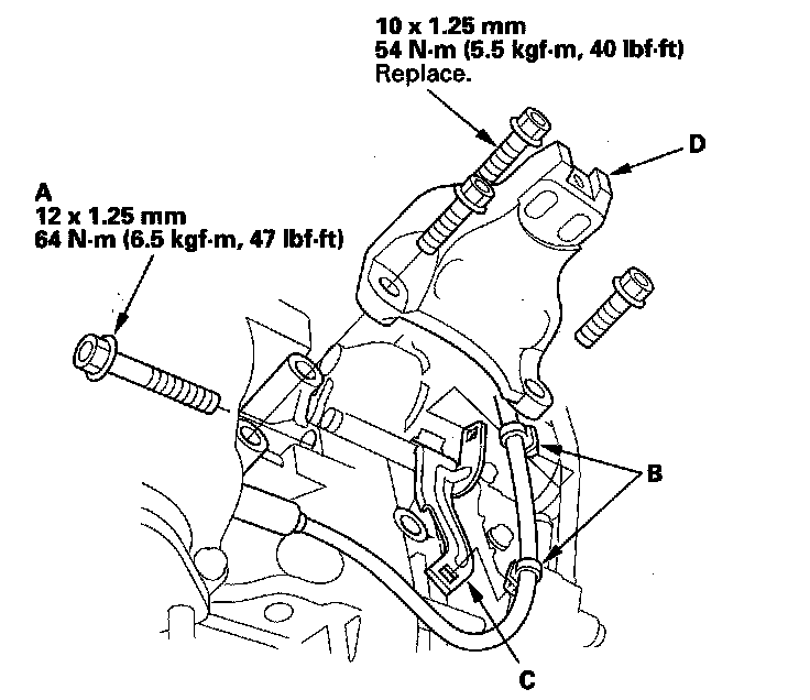 12. Install the front mount bracket (D) with the new mounting bolts.