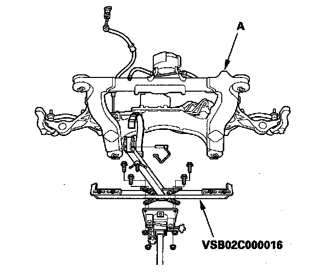 20. Support the front subframe (A) with the front subframe adapter (VSB02C000016) and a jack, and lift it up to body.