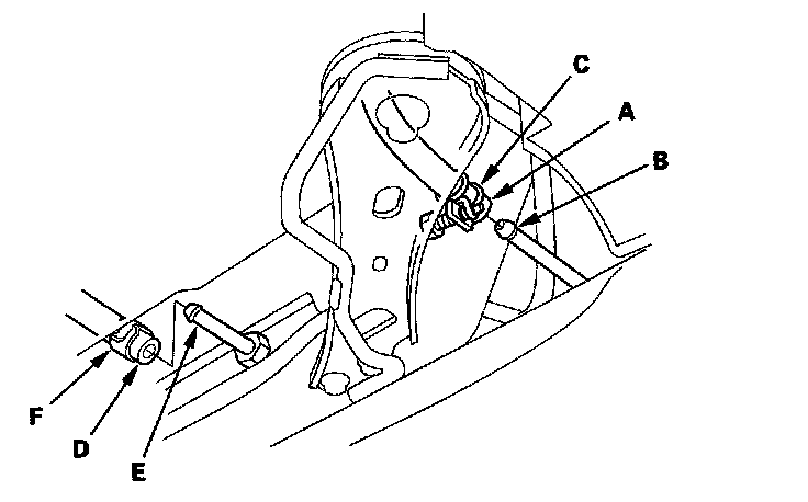 43. Install the stabilizer links (C) to the lower arms, and install the nuts (D). Insert a 6 mm Allen wrench (E) in the ball joint pin (F), and tighten the nuts.