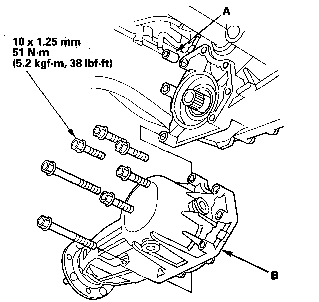 32. Attach the torque converter to the drive plate (A) with eight bolts (B). Rotate the crankshaft pulley as necessary to tighten the bolts to 1/2 of the specified torque, then to the final torque, in a crisscross pattern. After tightening the last bolt, check that the crankshaft rotates freely.