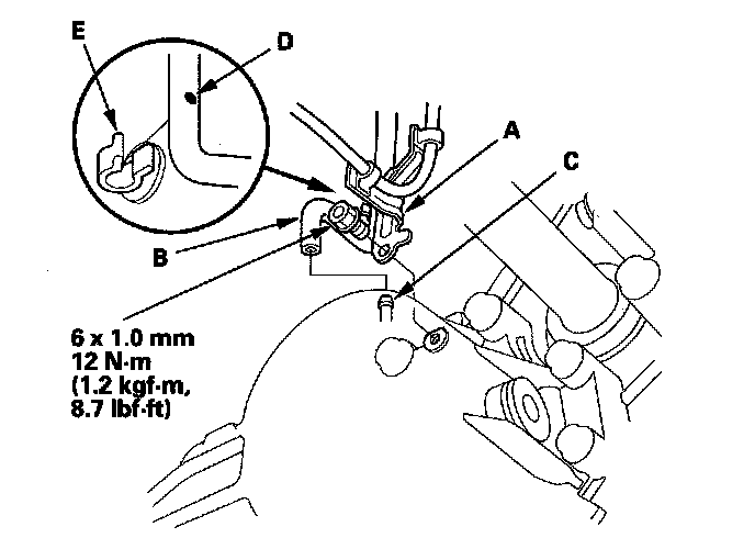 61. Attach the shift cable end to the control lever (C), then insert the control pin (D) into the control lever hole through the shift cable end, and secure the control pin with the spring clip/washer (E).