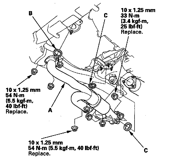41. Install exhaust pipe A with the new self-locking nuts and new gaskets (B) (C).
