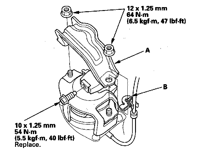 46. Install the new front mount bolt, and install the front mount stop (A) and vacuum hose clamp (B).