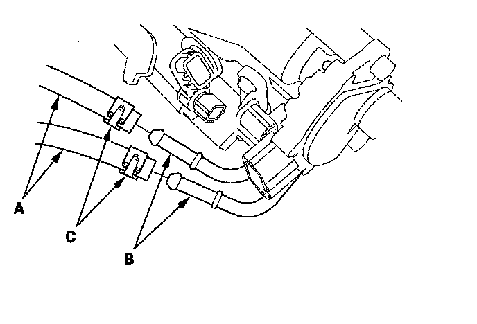 53. Connect the ATF cooler hoses (A) to the ATF cooler lines (B), and secure the hoses with the clips (C).