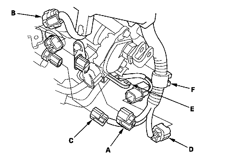 54. Connect the output shaft (countershaft) speed sensor connector (A), input shaft (mainshaft) speed sensor connector (B) and 3rd clutch transmission fluid pressure switch connector (C). Connect ATF temperature sensor connector (D), and install the connector on the connector bracket (E). Install the harness clamp (F) on the bracket.