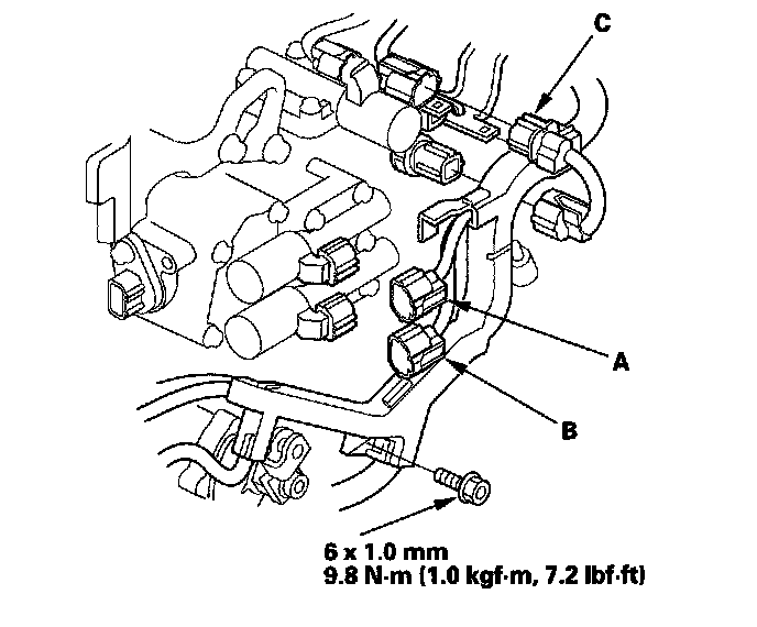 59. Secure the harness cover with the bolt, and connect the A/T clutch pressure control solenoid valve A connector, A/T clutch pressure control solenoid valve B connector, and 4th clutch transmission fluid pressure switch connectors (C).