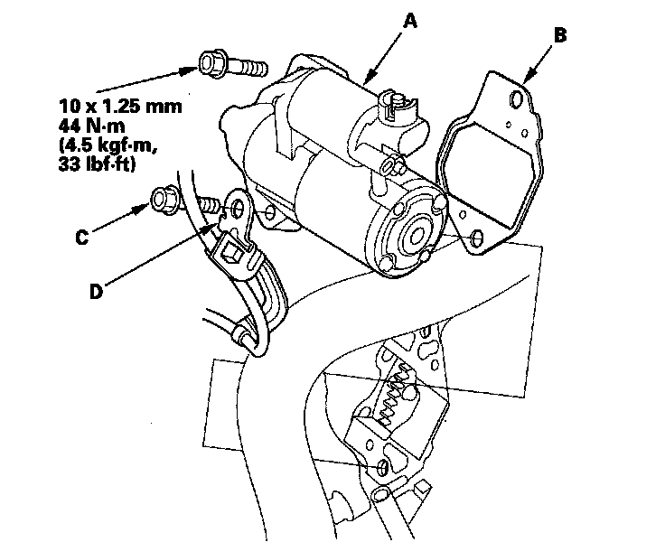 63. Install the starter (A) and the new gasket (B); install the lower bolt (C) through the sensor harness clamp bracket (D).